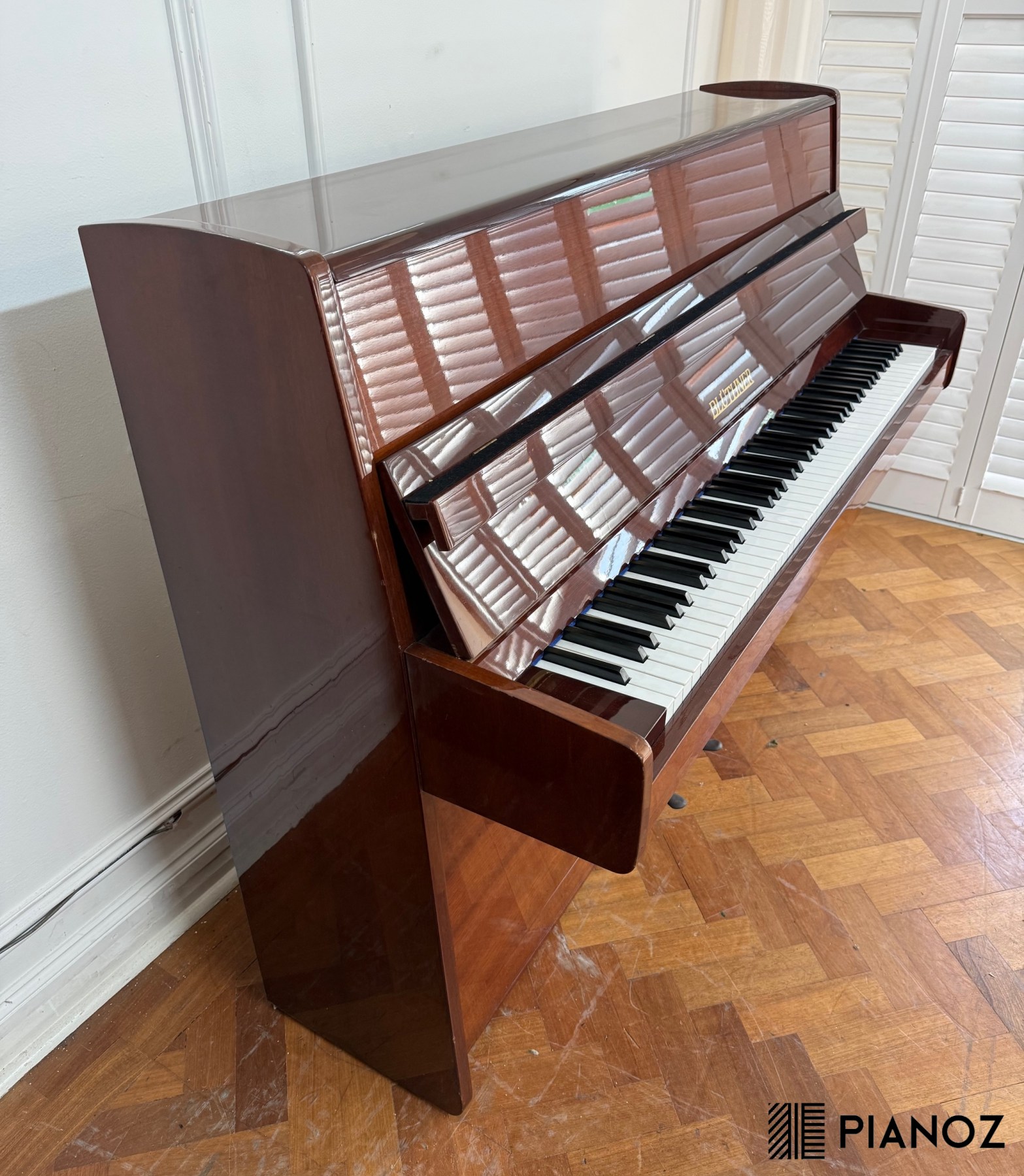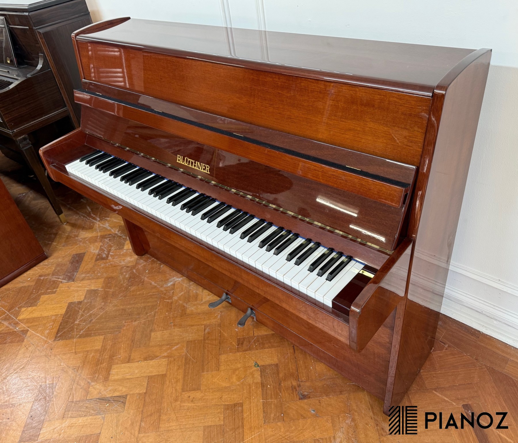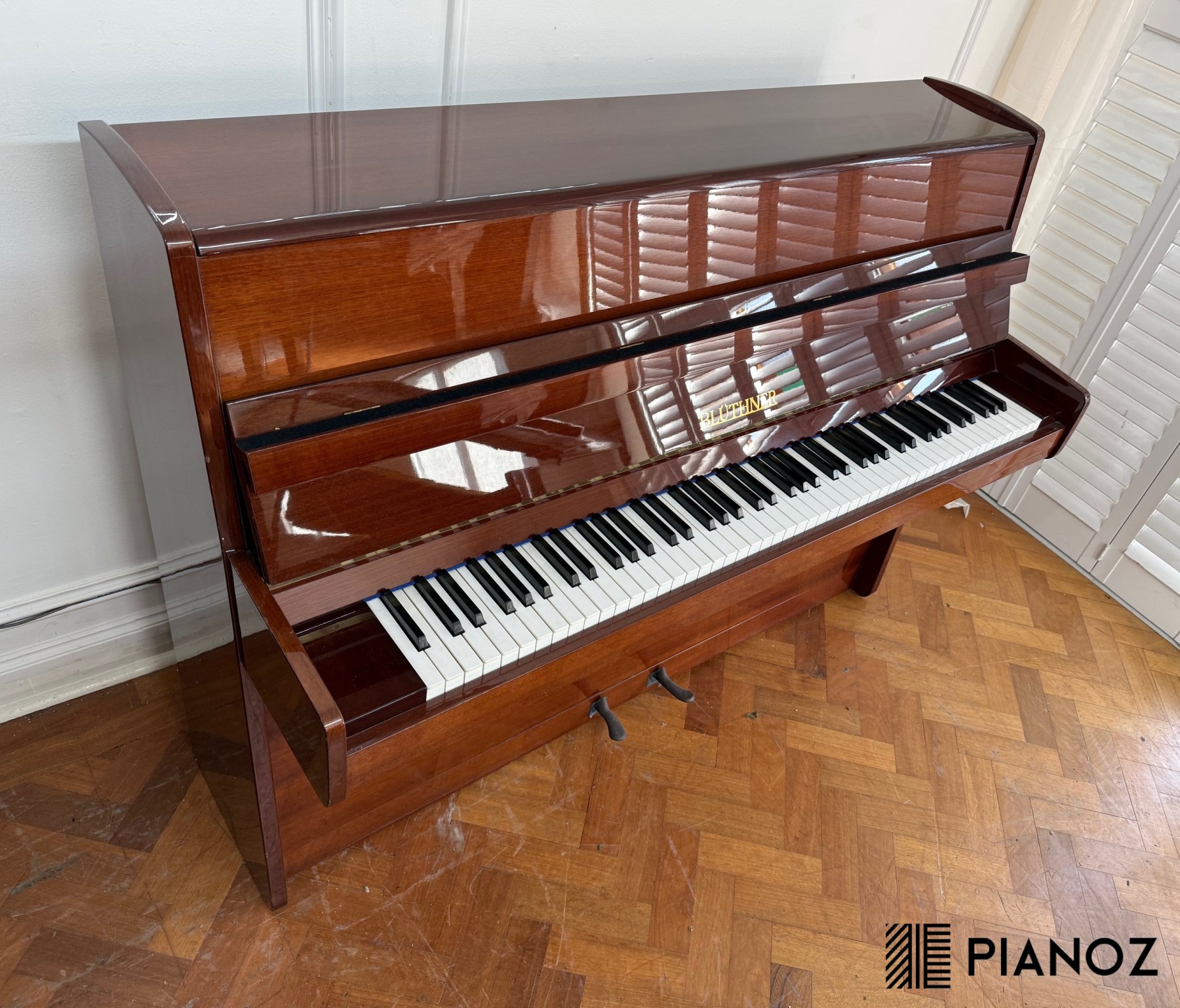 A modern Bluthner 112 upright piano in a wood high gloss case